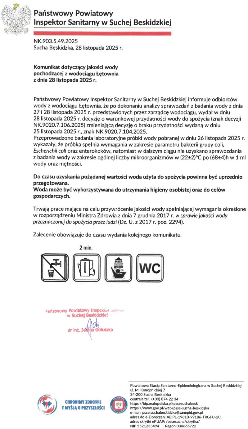Komunikat PPIS w Suchej Beskidzkiej dot. jakości wody pochodzącej z wodociągu Łętownia z dnia 28 listopada 2025 r.