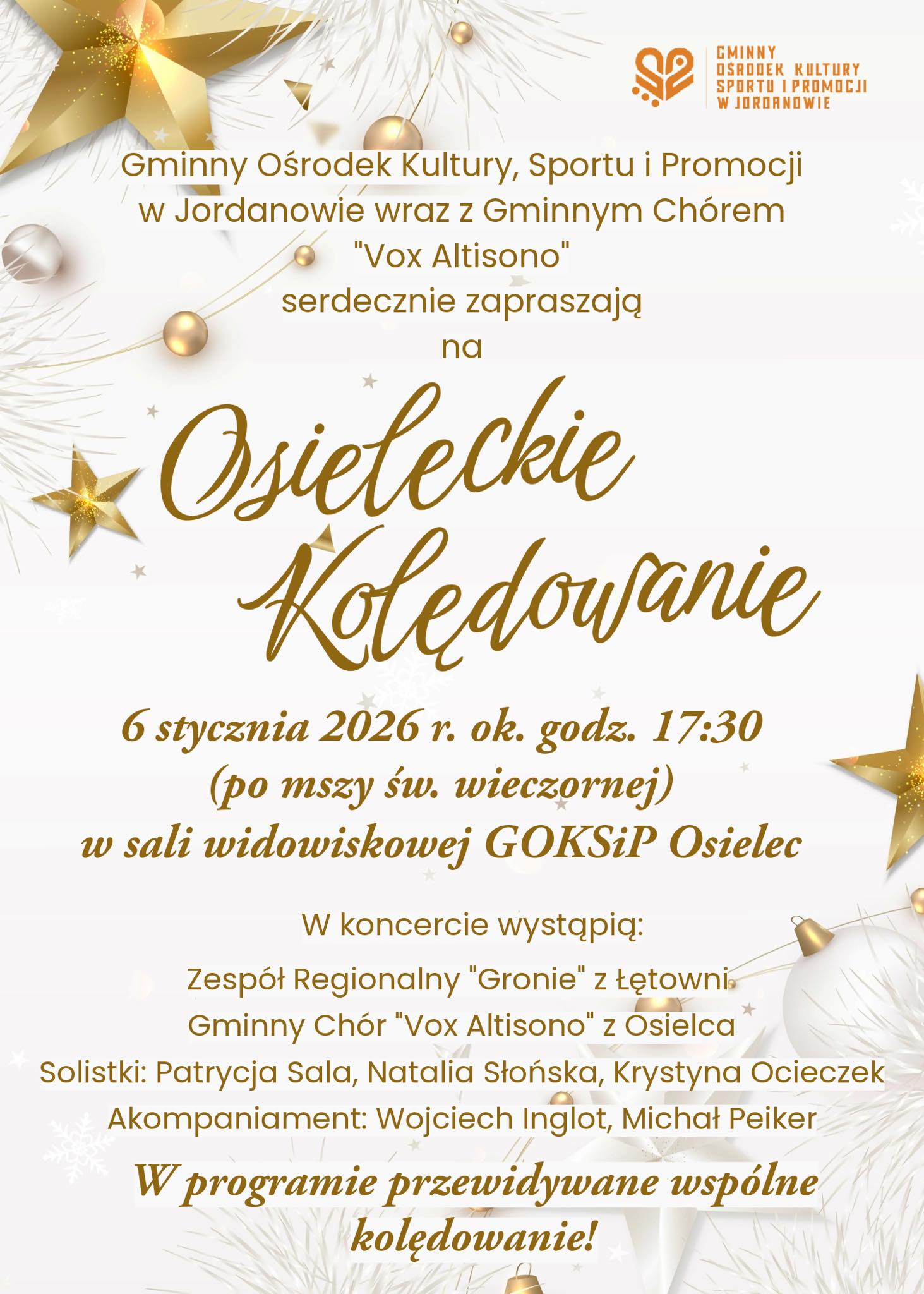 W imieniu organizatorów serdecznie zapraszamy do Osielca na wspólne kolędowanie. W programie m.in występy artystyczne Gminnego Zespołu Regionalnego "Gronie" z Łętowni i Gminnego Chóru "Vox Altisono" z Osielca, a także wspólne śpiewanie kolęd.