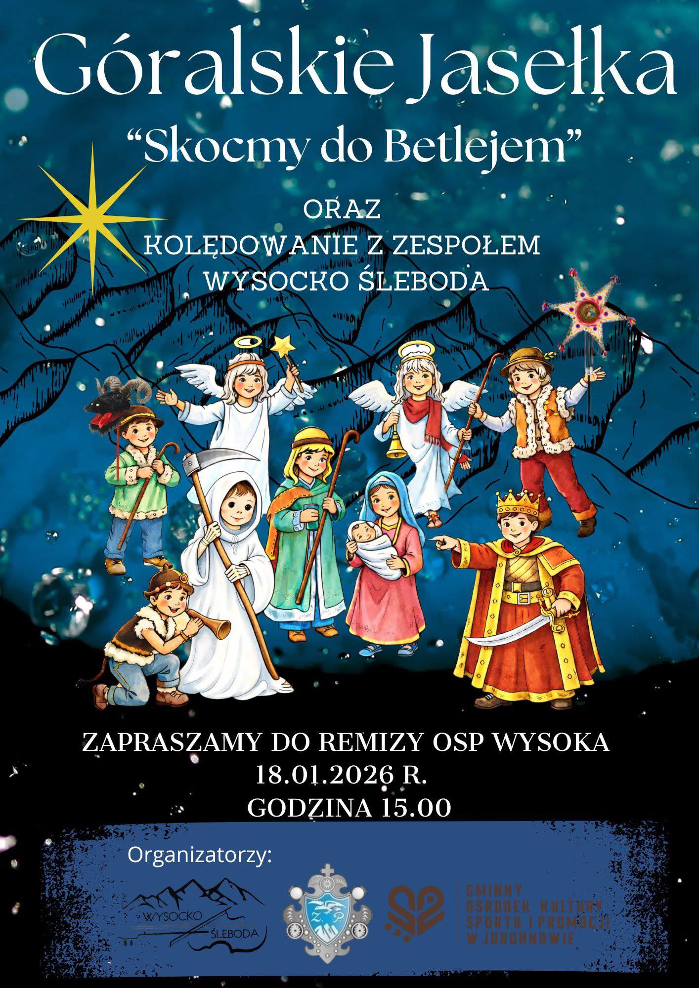 Zespół Regionalny "Wysocko Śleboda", Związek Podhalan Oddział w Wysokiej oraz Gminny Ośrodek Kultury, Sportu i Promocji w Jordanowie Filia w Wysokiej zapraszają na tradycyjne Jasełka Góralskie oraz wspólne kolędowanie z zespołem „Wysocko Śleboda” 18.01.2026 r. o godzinie 15.00 w remizie OSP W Wysokiej.