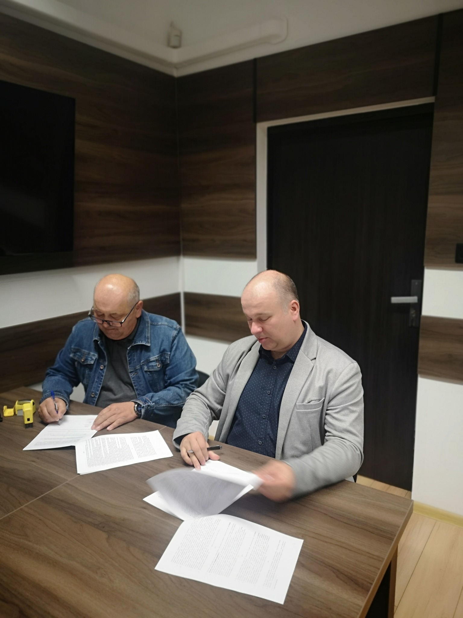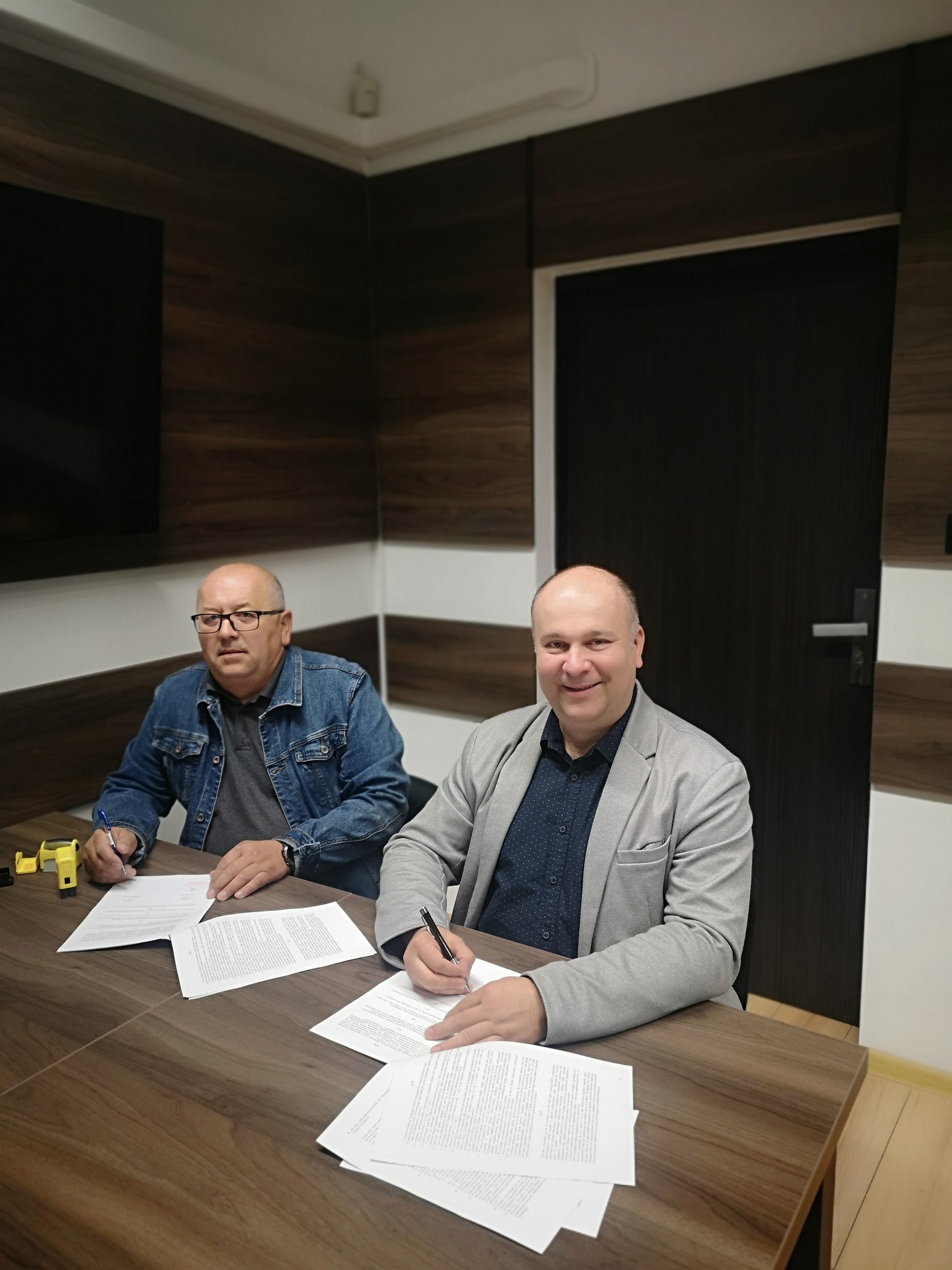 Wójt gminy Jordanów Artur Kudzia i prezes OSP Toporzysko Grzegorz Rączka podpisali umowę na dofinansowanie inwestycji pn. "Wykonanie remontu klatki schodowej w budynku remizy OSP Toporzysko".