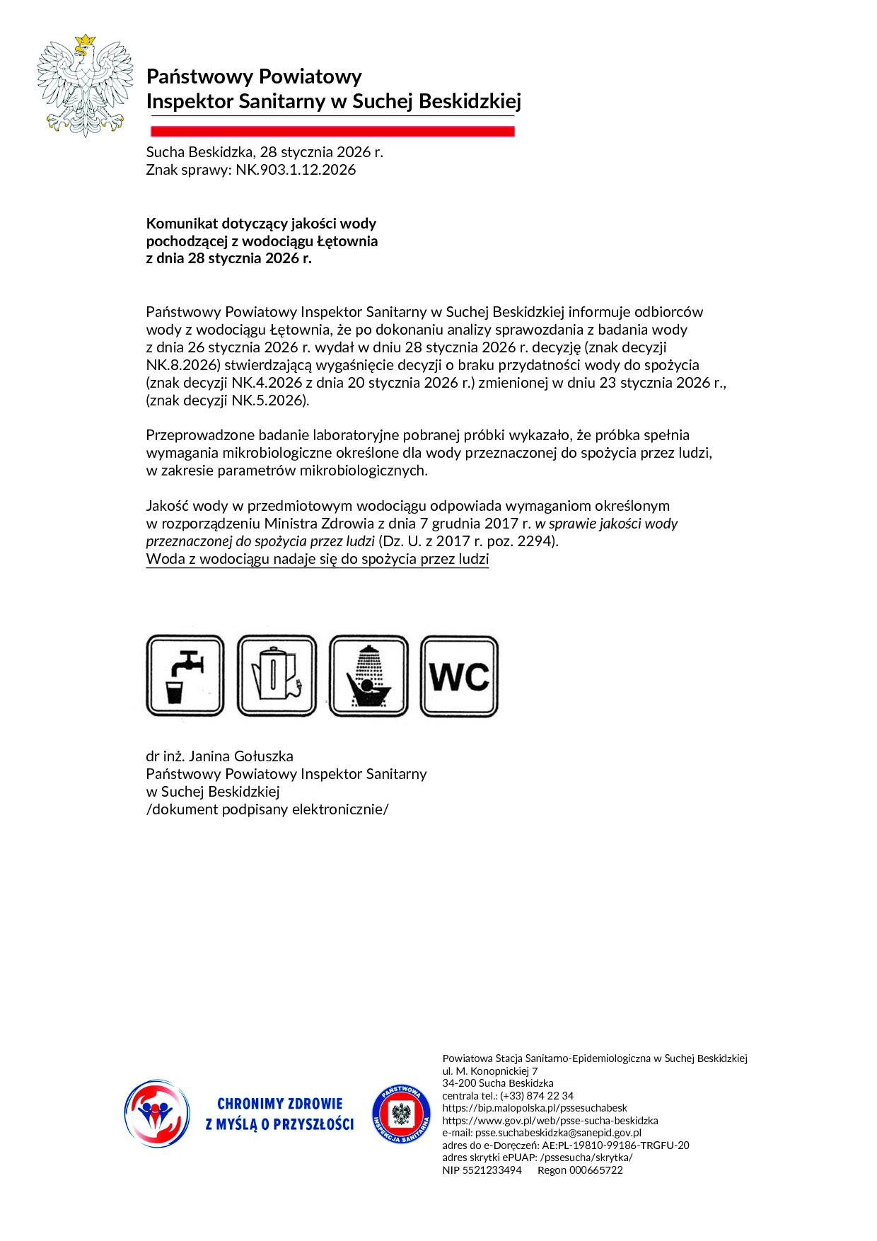 Komunikat PPIS w Suchej B. z dnia 28.01.2026r. dot. jakości wody z wodociągu w Łętowni