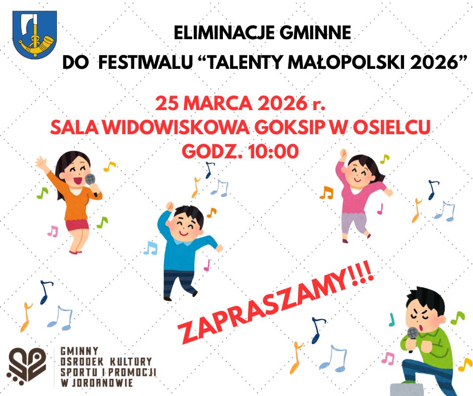 Gminny Ośrodek Kultury, Sportu i Promocji w Jordanowie zaprasza dzieci i młodzież od 6 do 24 lat do udziału w gminnych eliminacjach do Festiwalu "Talenty Małopolski 2026".