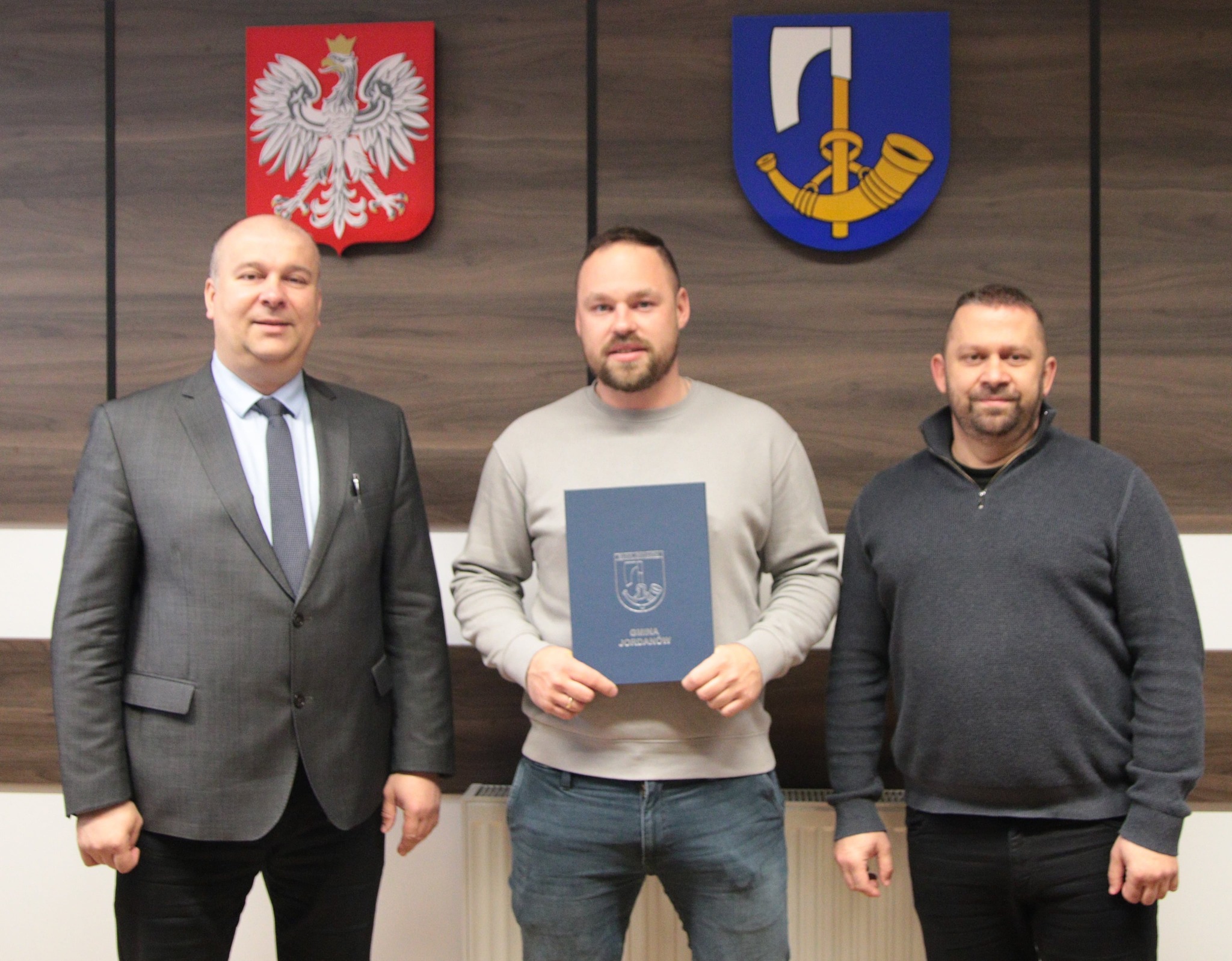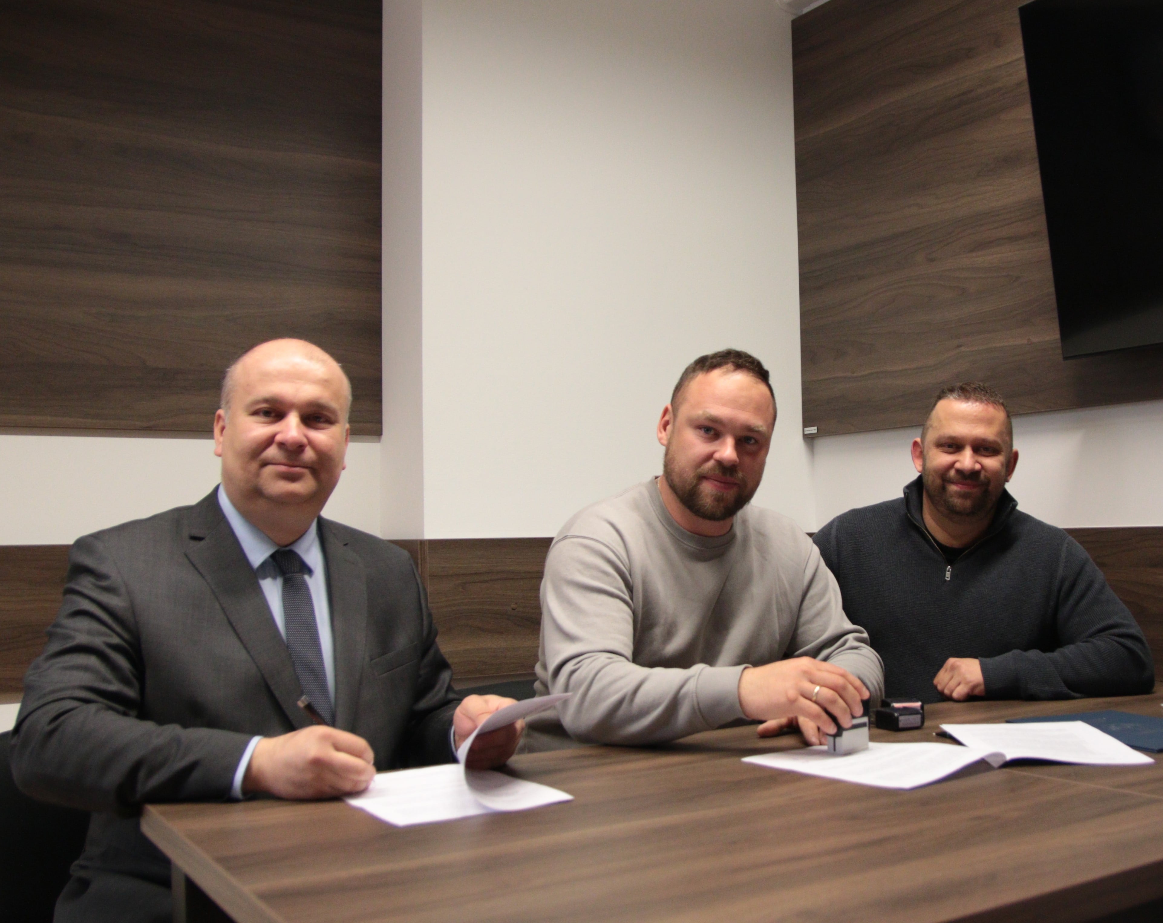 Podczas krótkiego spotkania umowę podpisał gospodarz gminy oraz prezes Mateusz Motor wraz z księgowym Rafałem Bednarzem.